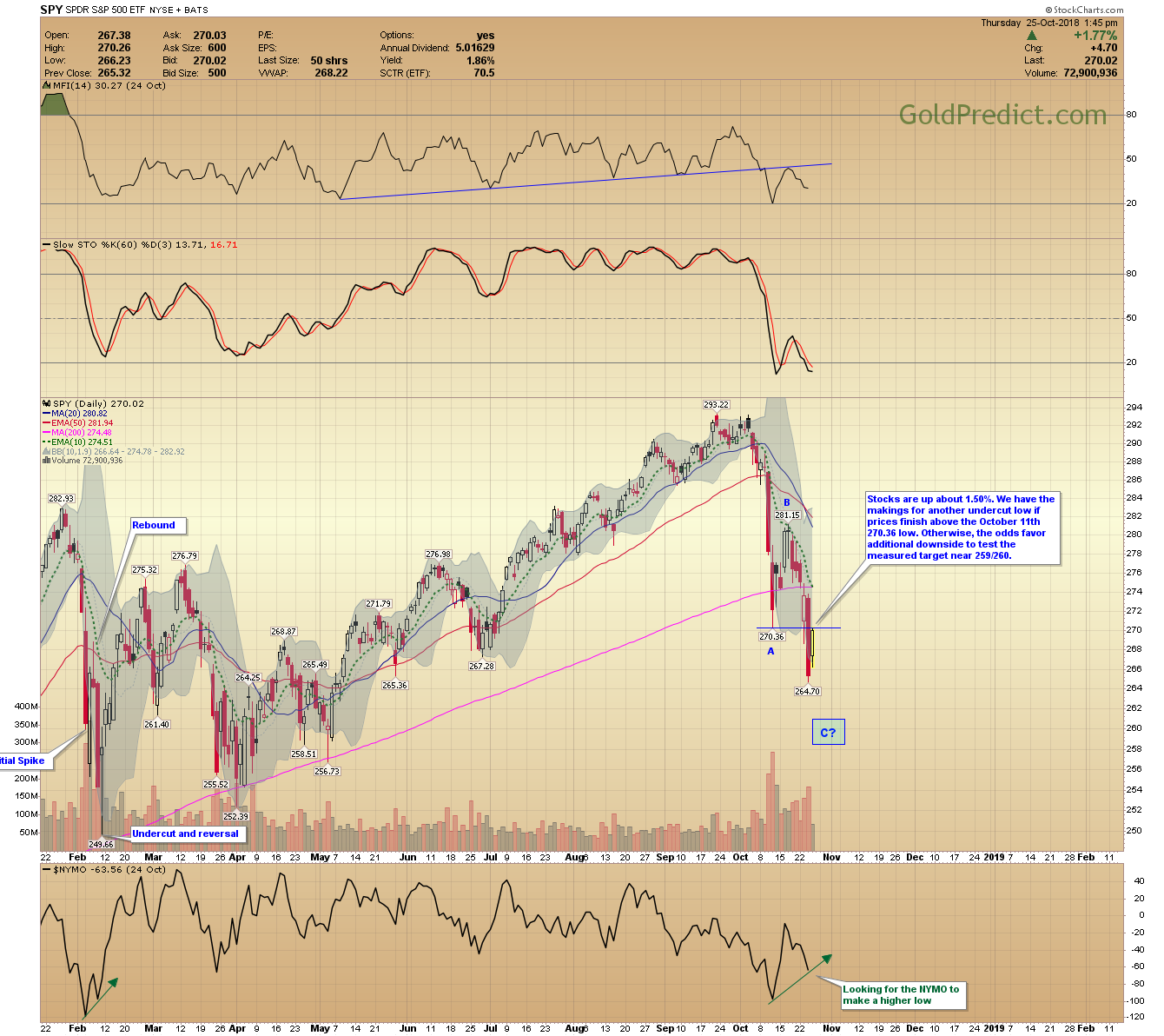 -SPY- Stocks are up about 1.50%. We have the makings for another undercut low if prices finish above the October 11th 270.36 low. Otherwise, the odds favor additional downside to test the measured target near 259/260.