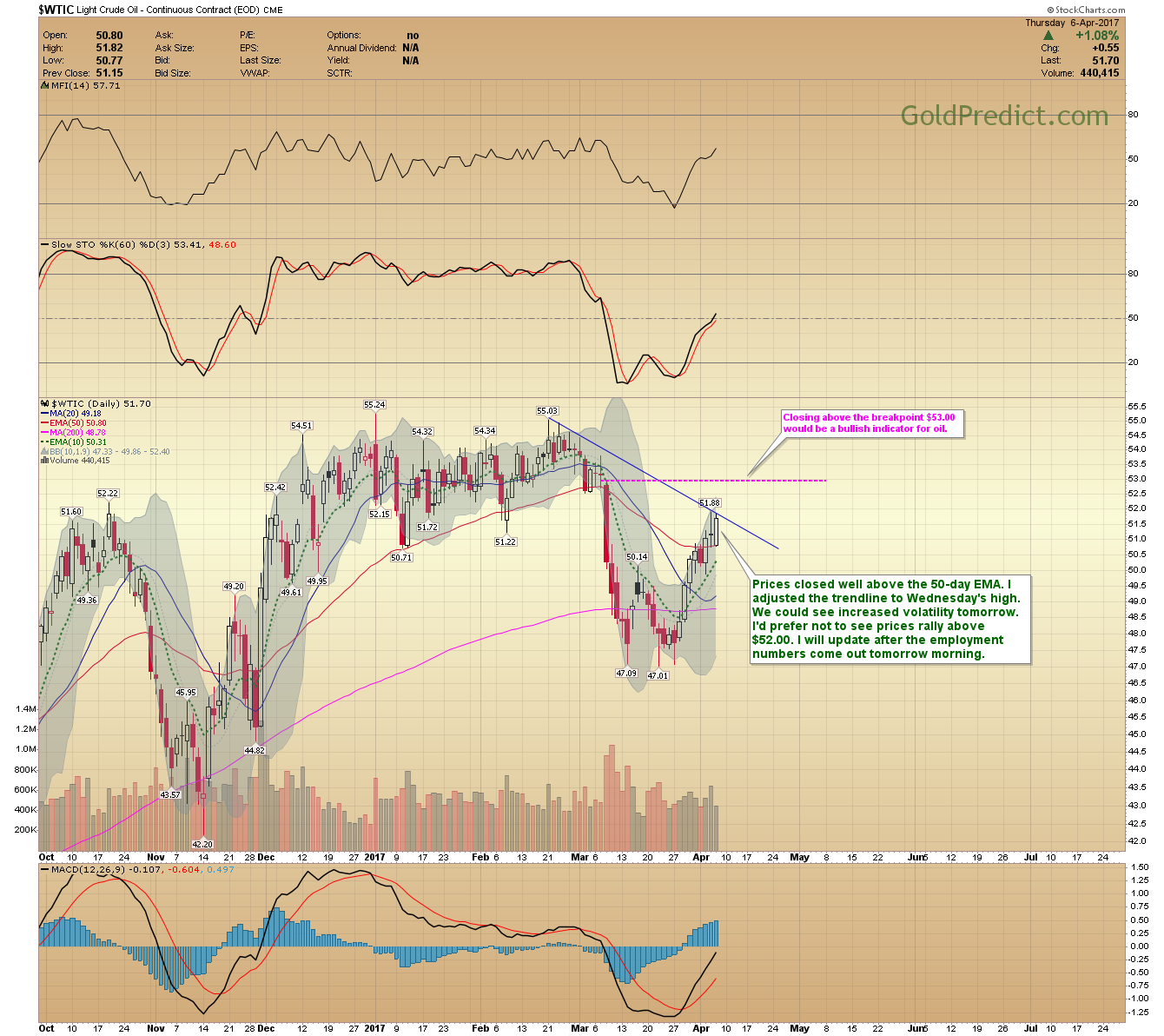 -WTIC- Prices closed well above the 50-day EMA. I adjusted the trendline to Wednesday’s high. We could see increased volatility tomorrow. I’d prefer not to see prices rally above $52.00. I will update after the employment numbers come out tomorrow morning. Closing above the breakpoint ($53.00) would be a bullish indicator for oil.