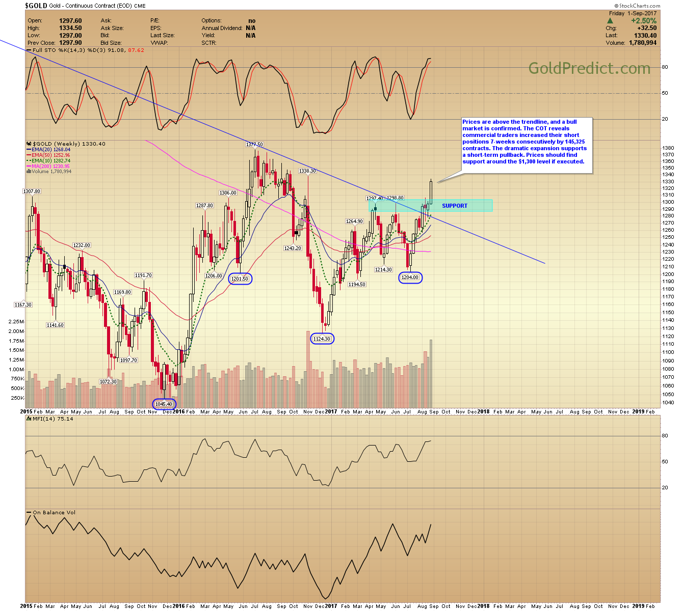 -GOLD WEEKLY- Prices are above the trendline, and a bull market is confirmed. The COT reveals commercial traders increased their short positions 7-weeks consecutively by 145,325 contracts. The dramatic expansion supports a short-term pullback. Prices should find support around the $1,300 level if executed.